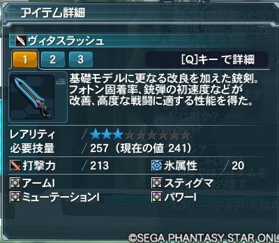 ところでレアリティの高い武器を改造して、アホみたいなダメージ表記がされているPSO2ですが、コスチュームとアクセサリーに資金を投じている私にとって、あのアホみたいな性能の武器とはまったく縁がないです。